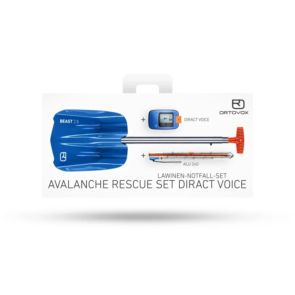 Avalanche Rescue Set Diract Voice från Ortovox är ett säkerhetskit för laviner som innehåller: Diract Voice lavinsändare, Alu 240 lavinsond och Beast Classic spade.